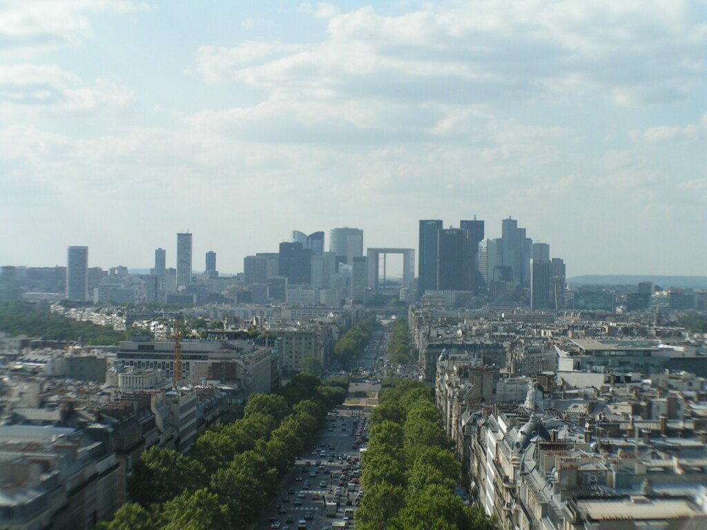 写真は凱旋門の上からラ・デファンス方面を撮ったものです。凱旋門とは違いますがグランダルシュLa Grande Arche(日本では新凱旋門とも呼ばれています)が見えます。これは何かの勝利を記念した建造物ではなく、門のような形をした1989年に落成した高層建築物です。フランス語の意味は「大きなアーチ」です。
